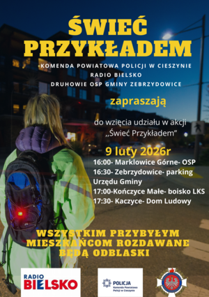 Już 9 lutego br. Komenda Powiatowa Policji w Cieszynie wraz z Radio Bielsko i druhami OSP Gminy Zebrzydowice zapraszają wszystkich mieszkańców do udziału w akcji „Świeć Przykładem”. To wyjątkowa inicjatywa promująca bezpieczeństwo na drodze, podczas której uczestnicy otrzymają praktyczne odblaski i porady. Wydarzenie odbywa się w kilku miejscowościach gminy, dzięki czemu każdy ma szansę wziąć udział blisko swojego miejsca zamieszkania. Warto skorzystać z tej okazji i zadbać o swoją widoczność oraz bezpieczeństwo zimą na ulicach.
