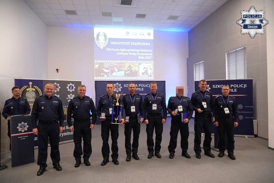 Policjanci z Komendy Powiatowej Policji w Cieszynie sięgnęli po najwyższe trofeum w Polsce, zwyciężając w VIII Ogólnopolskim Konkursie „Policjant Służby Kryminalnej Roku 2025”. Po trzech latach nieprzerwanego panowania w eliminacjach wojewódzkich, po srebrze w 2023 r. i brązie w 2024 r. – nadszedł moment na pełen triumf, tytuł najlepszych w kraju! Uroczysty finał odbył się 9 października w auli Szkoły Policji w Pile, z udziałem Zastępcy Komendanta Głównego Policji nadinsp. dra Tomasza Michułki, przedstawicieli Komend Wojewódzkich, dyrektorów biur KGP oraz zaproszonych gości.