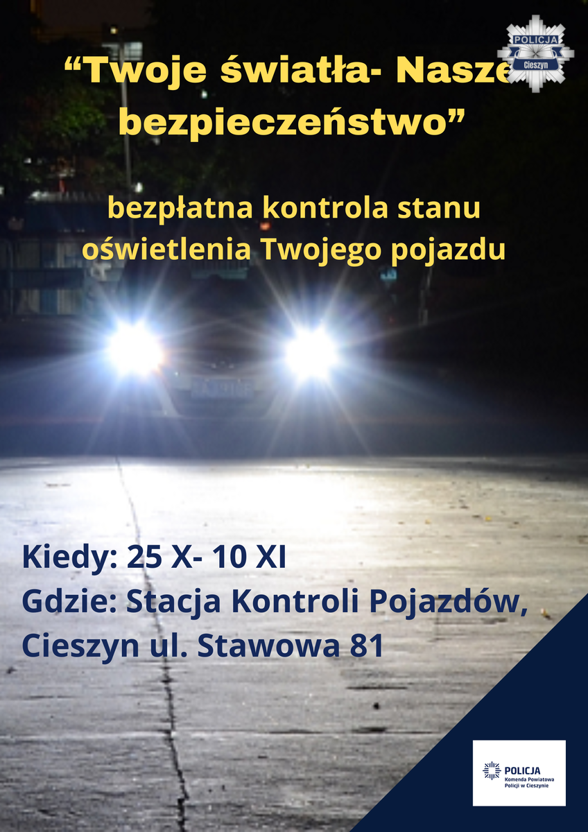 W dniach od 25 października do 10 listopada w stacji kontroli pojazdów przy ul. Stawowej 81 w Cieszynie policjanci z Komenda Powiatowa Policji w Cieszynie organizują kolejną odsłonę ogólnopolskiej kampanii „Twoje światła – Nasze bezpieczeństwo”.