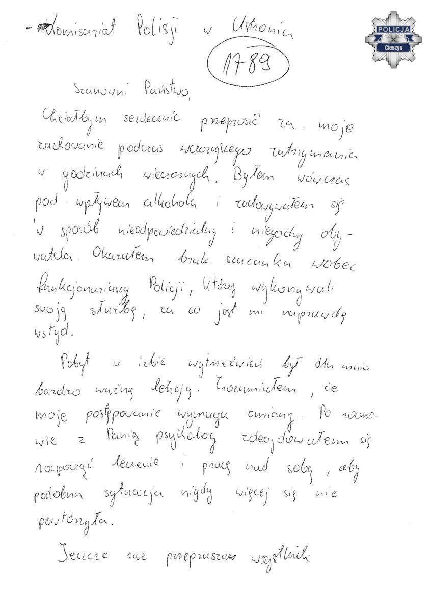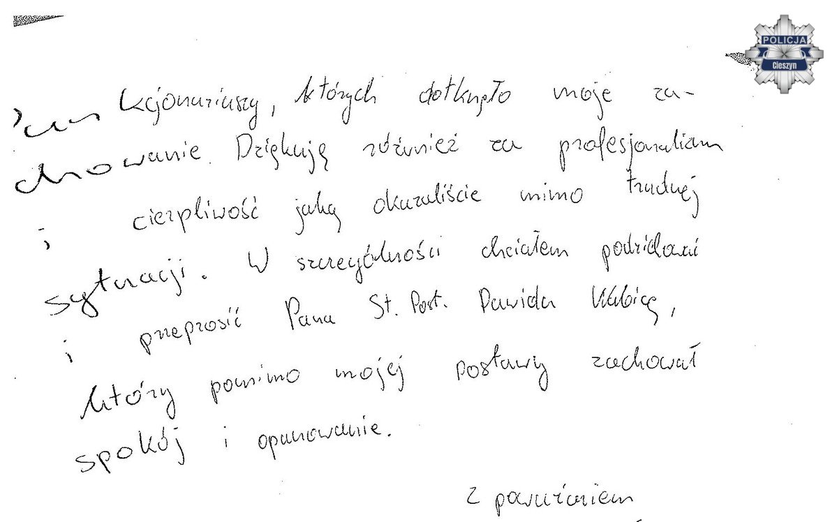 Do Komisariatu Policji w Ustroniu wpłynęły wyjątkowe podziękowania od mężczyzny, który został zatrzymany i doprowadzony do izby wytrzeźwień. W liście skierowanym do Komendanta Komisariatu Policji w Ustroniu przeprosił funkcjonariuszy za swoje zachowanie, dziękując im za profesjonalizm, cierpliwość i opanowanie.