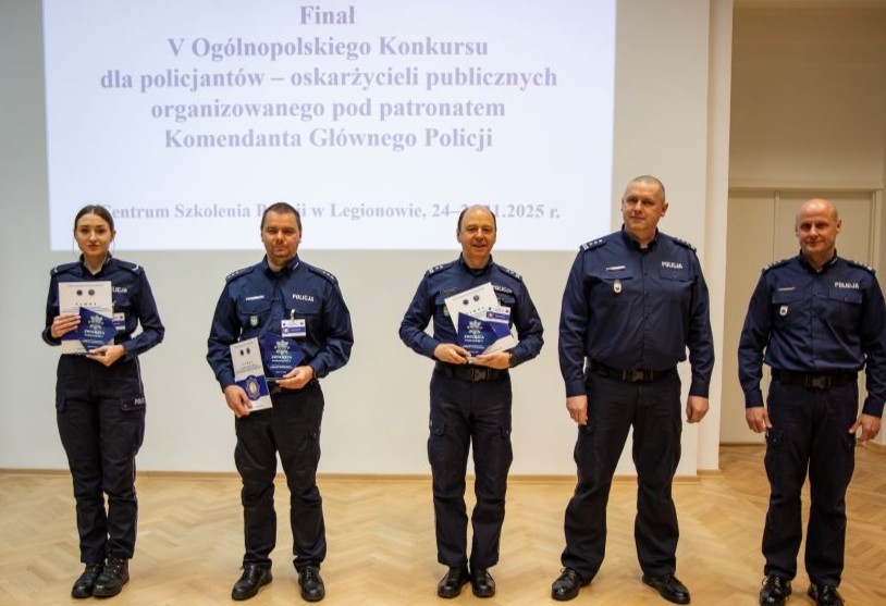 W dniach 24-26 listopada 2025 r. w Centrum Szkolenia Policji w Legionowie odbył się finał V Ogólnopolskiego Konkursu dla policjantów-oskarżycieli publicznych, w którym wzięło udział 34 najlepszych funkcjonariuszy z całego kraju. W jednej z konkurencji, którą stanowiła analiza akt sprawy, najlepszy w kraju okazał się policjant cieszyńskiej prewencji st. asp. Adrian Kłoda zdobywając maksymalną ilość punktów! Wspólnie ze swoim kolegą, jako reprezentanci Komendy Wojewódzkiej Policji w Katowicach, wywalczyli drużynowo wicemistrzostwo kraju!
