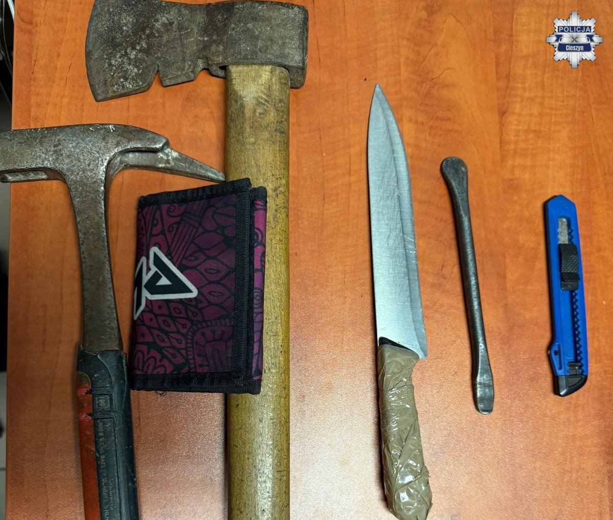 Niespełna trzy godziny po zdarzeniu policjanci zatrzymali podejrzewanego 27-letniego mężczyznę na jednym z osiedli w Ustroniu. Podczas interwencji mężczyzna posiadał przy sobie niebezpieczne narzędzia — noże oraz siekierę. Został obezwładniony przez policjantów i zatrzymany, a następnie doprowadzony do jednostki Policji.