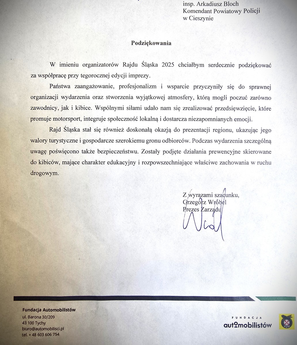 Podziekowania za sprawne zabezpieczenie Rajdu Śląska